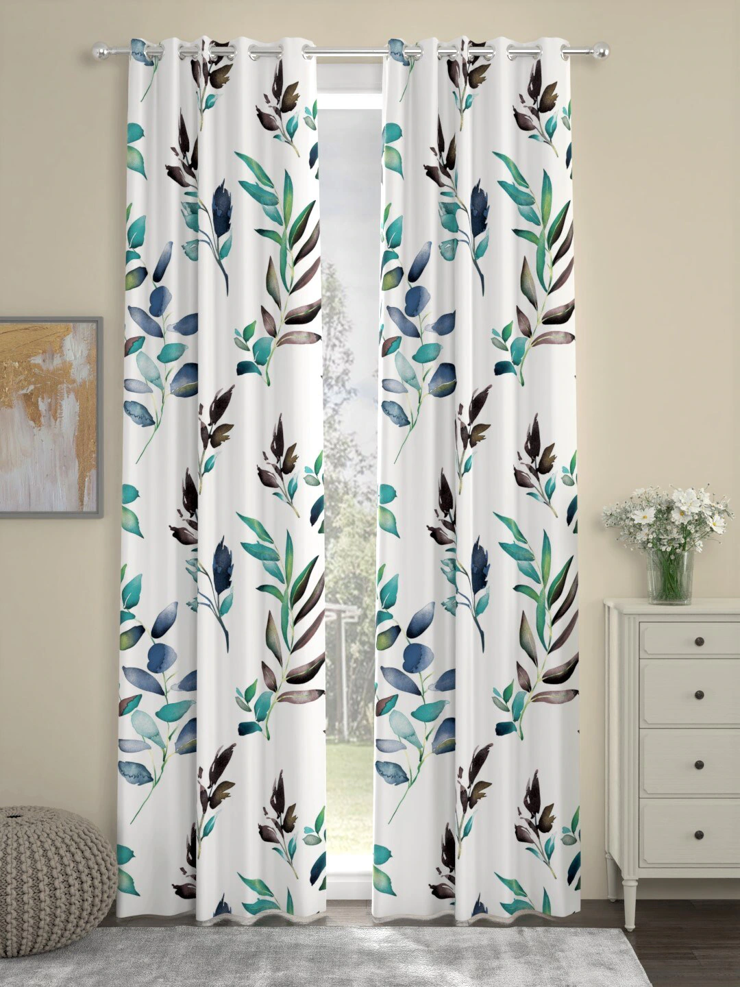 White & Teal Set of 2 Floral Door Curtains